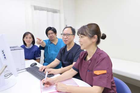 患者さんのケアを行いながら、医療スタッフへの指導、地域の看護師などへの研修や相談に応じるなど、各々が院内を横断的に活動するとともに、それぞれの分野の情報を定期的に共有し、様々な場面でスペシャリスト同士も協働しています。